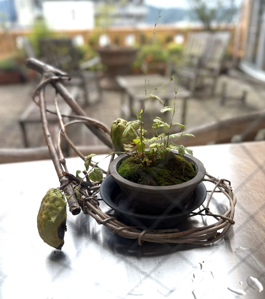 まだまだ暑い頃、鳥羽さんが、カリンの実が付いた枝で「実りの秋」のイメージでテラスのコーナーを飾って下さいました。早速、会員さん達が「あら、これカリン?」「自宅にもあるけど、こんな風に飾ったらいいのね」からおしゃべりが始まり、「いい香りよね」「焼酎に漬けてもいいのよね」とどんどん会話が広がっていました。テラスの植物が楽しい小さな集まりのきっかけになっていました。 ありがとうございます(^^)