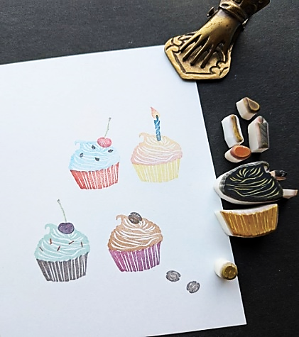 誕生日カードにも添えられる、カップケーキの消しゴムはんこを作ります。さくらんぼを乗せたり、ロウソクを立てたり。チョコのコーヒーやスプレーチョコ、チョコチップなどなど楽しんでアレンジしてみてください。