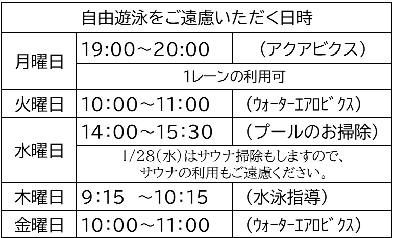 *但し、下記の時間帯は、プールを全面使いますので、自由遊泳はご遠慮下さい。
