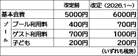 今後も皆様と一緒にアーズローカスで歩んでいきたいので、誠に心苦しいですが、2026年1月から基本会費及びプールの利用料を改定させていただきたく思います。