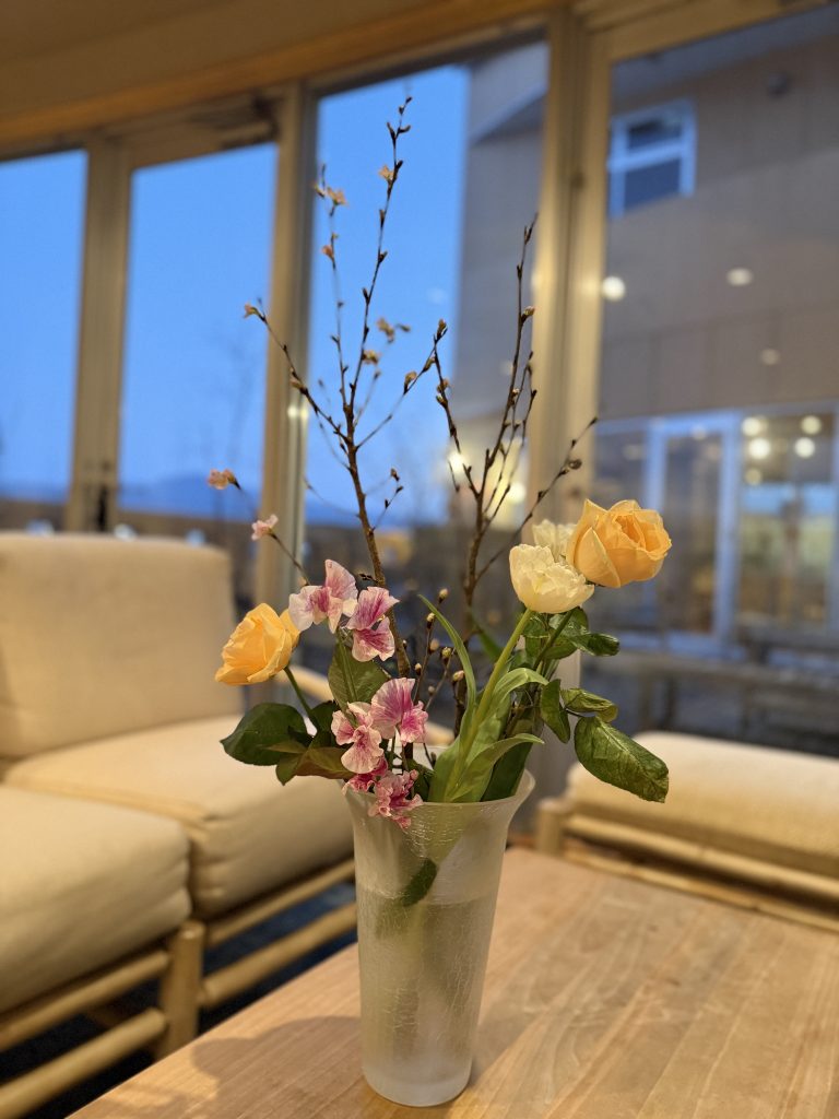 京都生花株式会社にお勤めの水泳教室指導の小笹祥之さんが、ひと月に一度、元気が良くて、利口で、その時一番のお薦めのお花を市場から選んで下さり、みんなで分けて楽しんでいます。