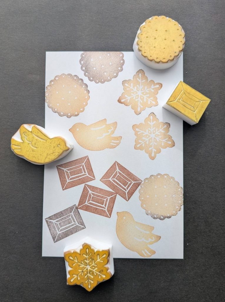 2月のはんこモチーフは、クッキーやチョコレートなど、バレンタインの頃のお便りにぴったりな、可愛いお菓子はんこです。色々と試しながら、リアルな焼き色がきれいに出るインクの色や、色の付け方も練習していきます。結晶模様のアイシングクッキーは、トレーシングが肝になりますよ。ビスケットにはメッセージを書き込んでも楽しいですし、切り抜いてラッピングに添えるのもとても可愛いです。